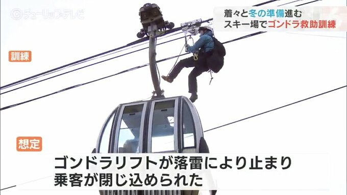 スキー場も着々と準備 ゴンドラリフトからの救助訓練 南砺市