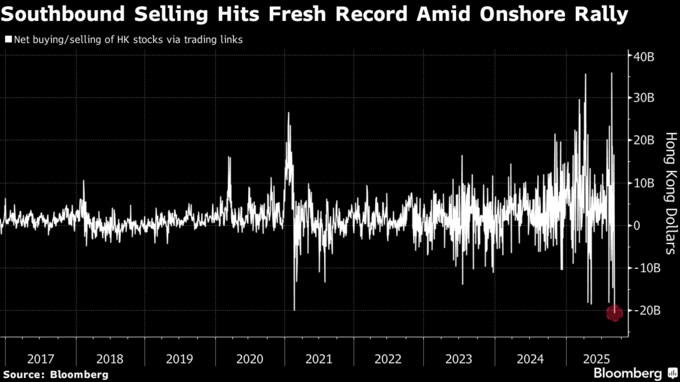 中国投資家の香港株売越額、過去最大更新-本土に資金環流の兆し