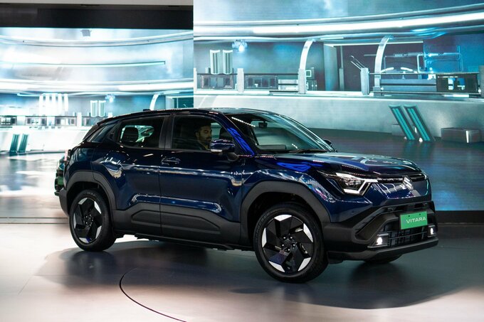 インドのモビリティショーで展示された「e ビターラ」(2025年1月17日、ニューデリー)