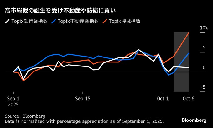 銀行株買い・不動産売りの「高市トレード」再燃-防衛株は大幅高
