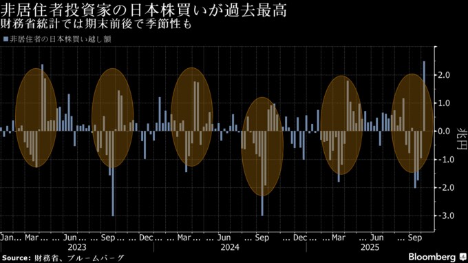 3. 海外勢の日本株買越額、東証データは12年半ぶり高水準-先物売り相殺