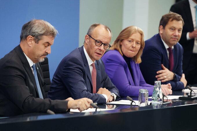 記者会見するメルツ首相(左から2番目)とクリングバイル財務相(一番右)(9日、ベルリン)