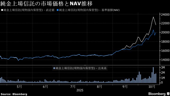 金ETF価格が異常事態、現物より割高続く-相場反転なら逆回転リスク
