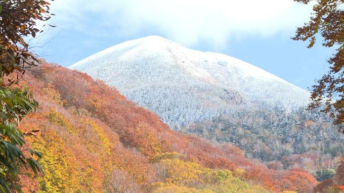 燃えるような紅葉と初雪をまとう山々 紅と白の競紅 青森県八甲田 見頃の最高潮は…