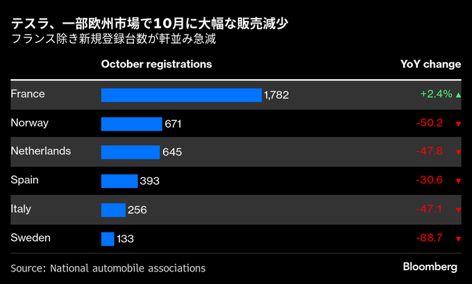 3. テスラ、欧州販売低迷続く-10月はオランダ、イタリアでほぼ半減