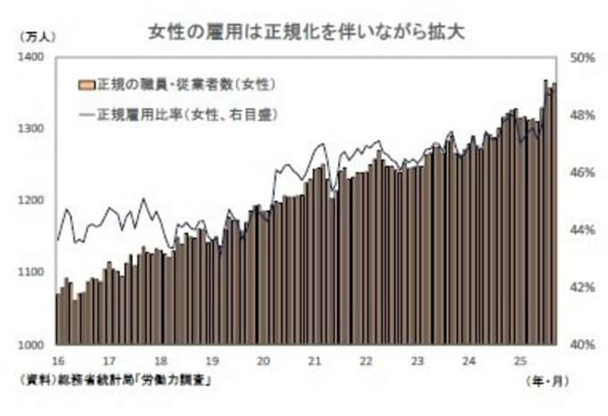 女性の正規雇用率が過去最高の48.8% 就業者数も3138万人で過去最高