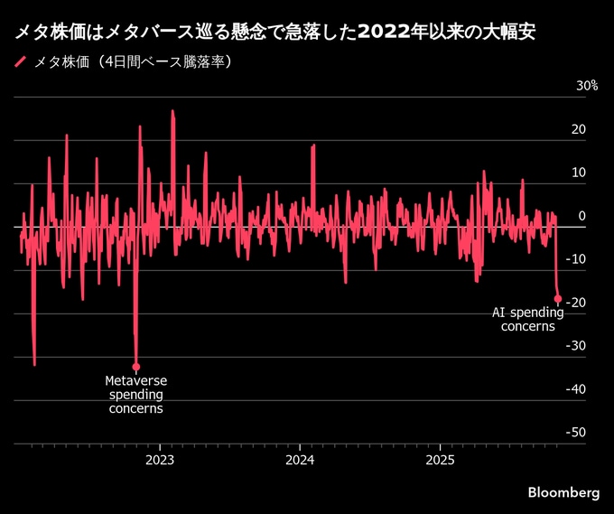 メタAI巨額投資を警戒、よぎるメタバース空振りの記憶-株急落が映す