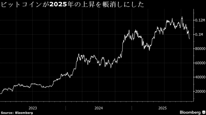 ビットコインが年初来の上げ帳消し、最高値から1カ月-リスク回避鮮明