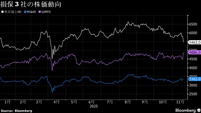 東京海上HD株が7カ月ぶり下落率、SOMPO株は上昇-決算受けて明暗