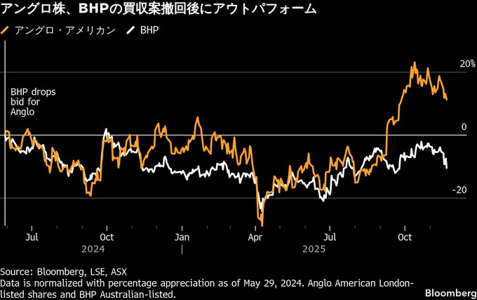BHP、アングロ・アメリカンへの新たな買収計画を断念-予備的協議後に