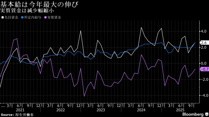3. 10月基本給は今年最大の伸び、日銀正常化後押し-実質賃金は減少幅縮小