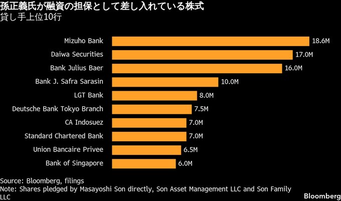 ソフトバンクG孫氏、金融機関への担保株21億ドル分減少-過去数カ月で