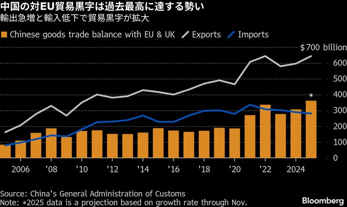 中国と欧州が対立必至、貿易不均衡が急拡大-「耐え難い」と仏大統領