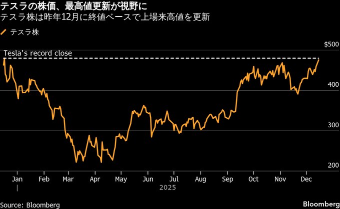 テスラ株、1年ぶりの最高値更新が視野に-AIブームが押し上げ