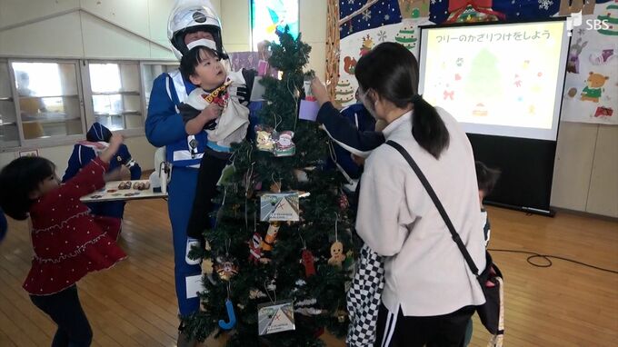 「あおはまわりをよくみてわたる」交通ルールの飾りつけ 下田保育所で一足早いクリ…