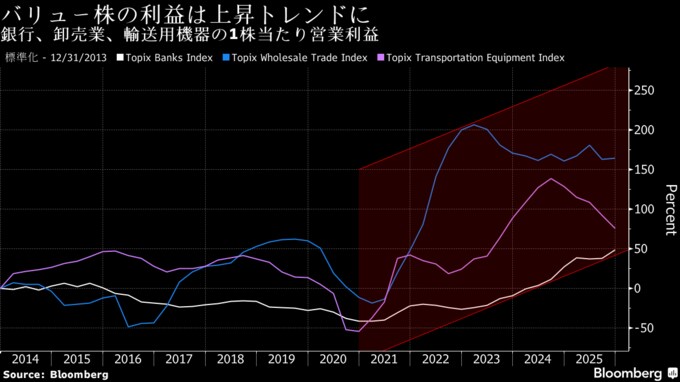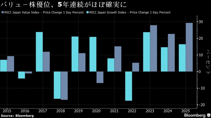 日本のバリュー株、5年連続グロース超えへ-物価高で来年も優勢予想