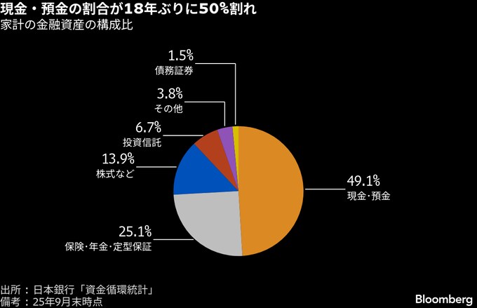 株高・円安で個人金融資産が過去最高、現預金比率は50%割れ-日銀