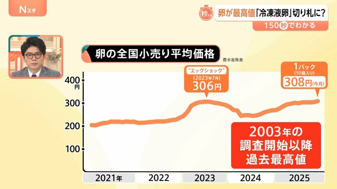 卵「1パック308円」調査開始以降で過去最高値、「冷凍液卵」が需給・価格安定の切り札に?【Nスタ解説】