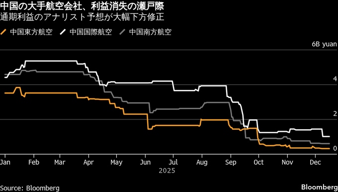 日中間の運航制限、中国の航空会社に打撃-通期黒字回復に暗雲