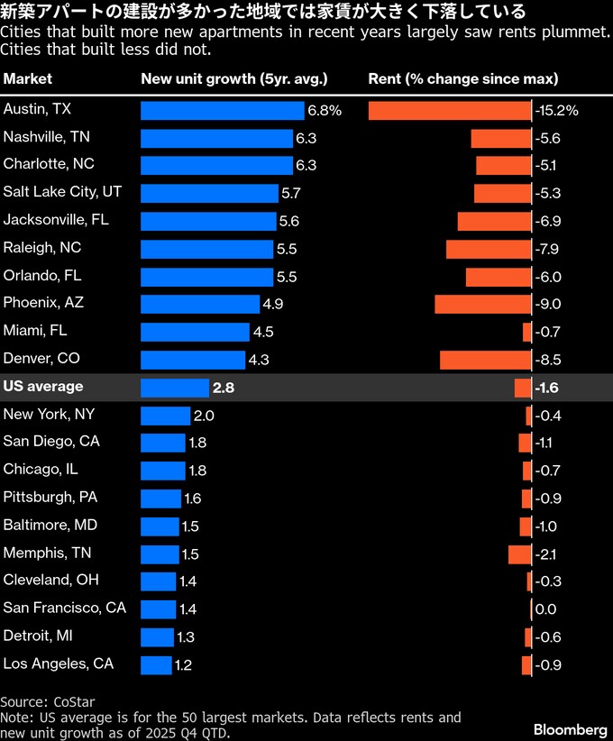 3. 住宅危機でも値下がり、米主要都市で家賃下落-背景に高級物件開発