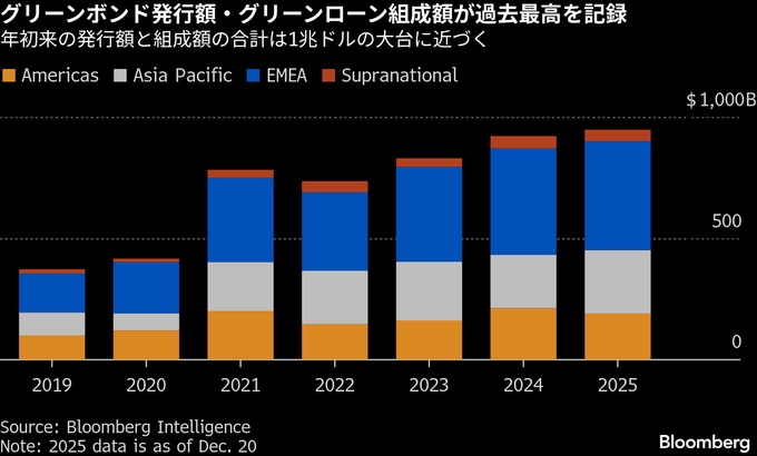 グリーンボンド・融資額、1兆ドルに近づく-電力需要見込む投資家殺到