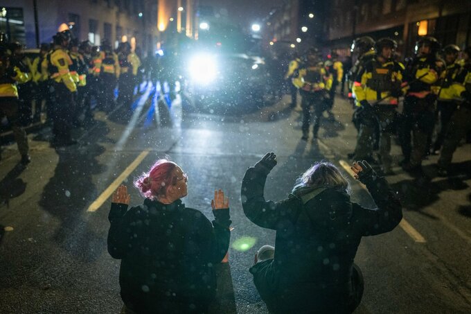 ICE職員滞在のミネアポリスのホテル前で警官がデモ隊を排除(1月9日)