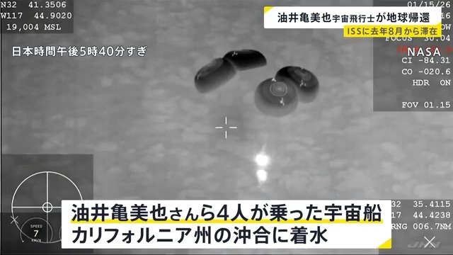 「人生で最も輝いていた瞬間」宇宙飛行士・油井亀美也さん 地球に帰還 米・カリフォルニア州沖合に着水 笑顔で手を振る 約5か月国際宇宙ステーションに滞在