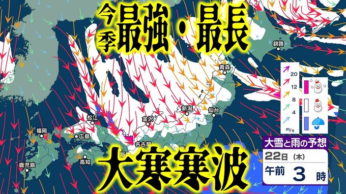 【今季最強・最長の大寒寒波】白い影に覆われ…“線状降雪帯”も形成か 21~22日ま…