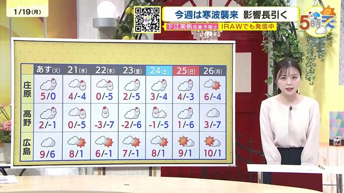 【あす1/20(火)広島天気 】雲が優勢 北部では雪も 気温急降下 防寒対策しっかりと