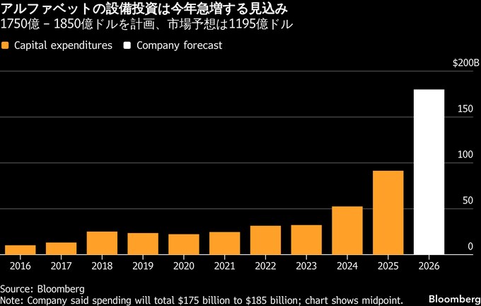 アルファベット、AI投資で今年最大1850億ドル想定-自信の表れとの評価