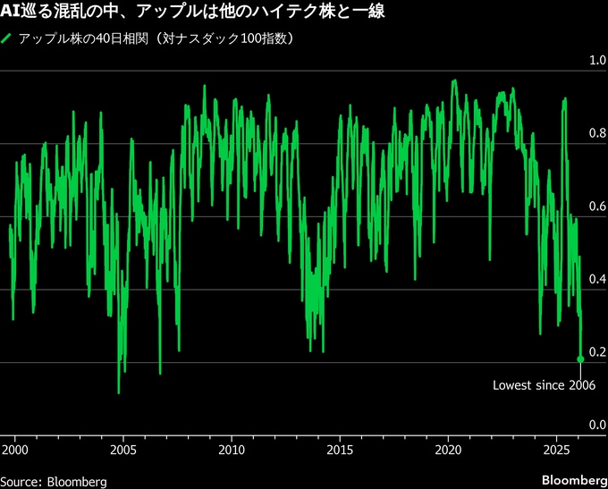 アップル、AI脅威論が支配する相場で異彩-ハイテク株安の中で逆行高