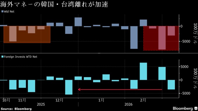 海外マネー、アジア株式市場から流出-AIブーム後退、中東情勢も懸念