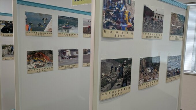 がれきの中で行方不明者の捜索にあたる様子、避難所で住民の話に耳を傾ける姿など紹介 岩手県立図書館で東日本大震災警察活動写真展 盛岡市