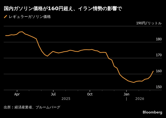 国内ガソリン価格161.8円、前週比3.3円上昇-中東混乱で原油高波及