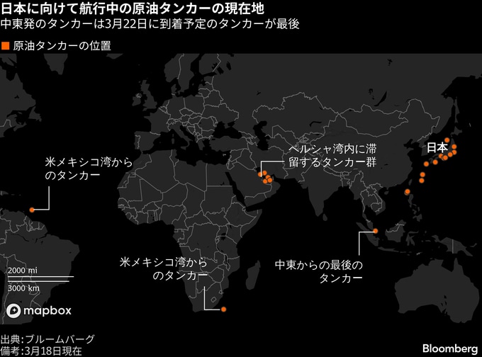 最後の中東発原油タンカー、22日に日本到着へ-地図から消える船の列