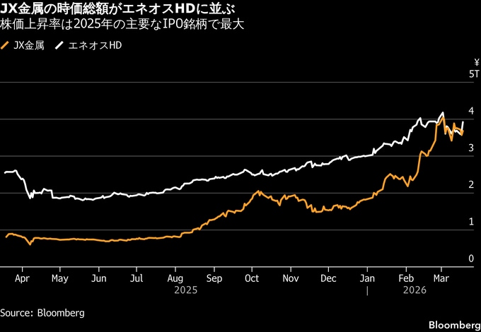JX金属株上場1年で4倍、時価総額は元親会社に比肩-事業分離後押しも
