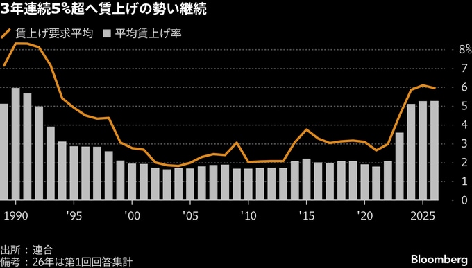 連合、春闘賃上げ率3年連続5%超へ順調なスタート-日銀正常化の支え