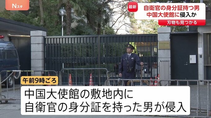 中国大使館敷地内に侵入か…自衛官の身分証持つ男を確保 敷地内で刃物1本発見 中国外務省は「厳正な申し入れを行い強く抗議」