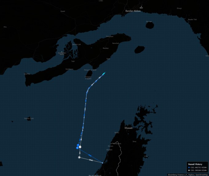 CSCLインディアン・オーシャン(白)とCSCLアークティック・オーシャン(青)がホルムズ海峡を東へ通過しようとイラン領海に向かって航行しているもよう