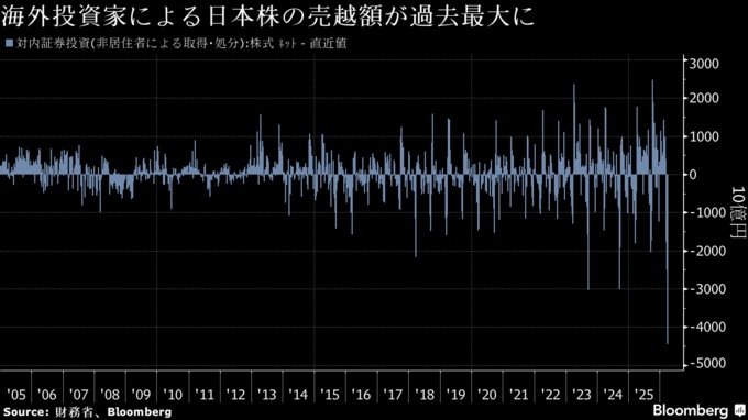 海外勢の日本株売り越し過去最大、貸株や配当巡る取引で-前週の財務省統計