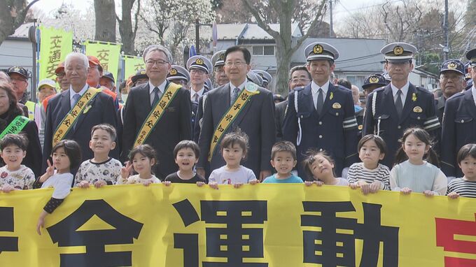 「手を挙げて横断歩道を渡ります」春の全国交通安全運動にあわせて開始式行われる …