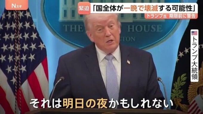 トランプ氏が警告「国全体が一晩で壊滅する可能性」 イランは徹底抗戦の姿勢を強調 一時的な停戦案を拒否したとの報道も