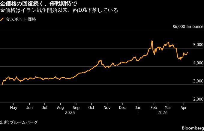 金価格が大幅上昇、トランプ氏が2週間のイラン停戦に同意