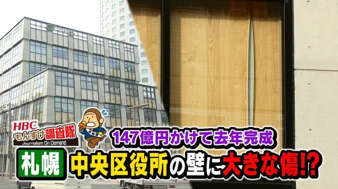 1年前に完成の区役所に異変?外壁ガラスに貼った「木のシート」が剥がれ無残な姿 …