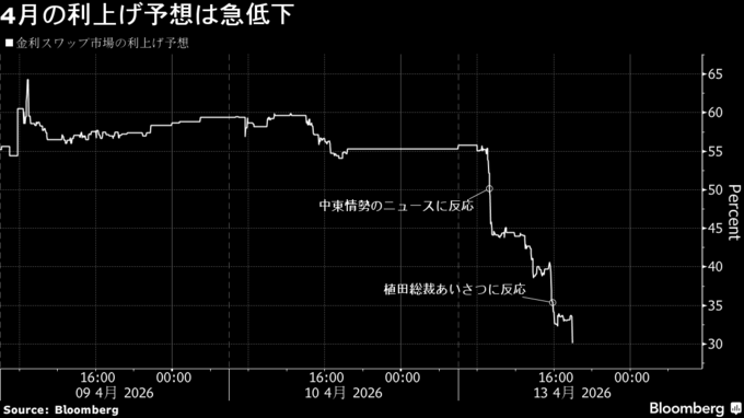 植田日銀総裁、中東注視し見通しやリスクを点検-4月利上げ予想は後退
