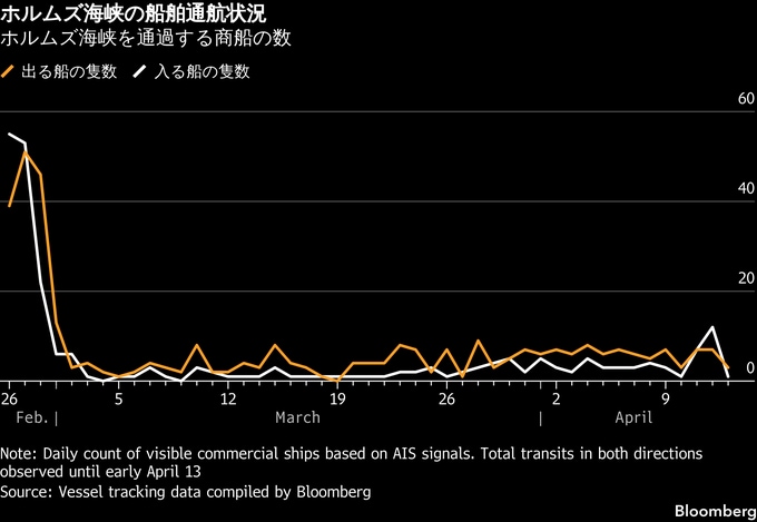 ホルムズ海峡の船舶通航急減-米国の海上封鎖前に警戒強まる