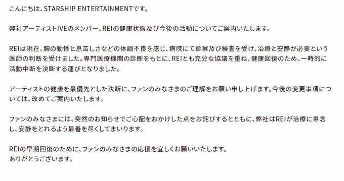 「IVE」メンバー・REIさん 芸能活動の一時中断を発表 体調不良のため「胸の動悸と…