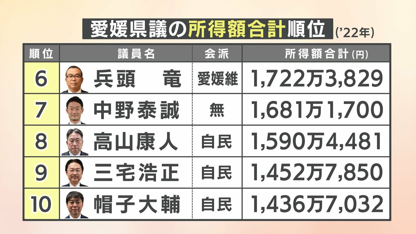 愛媛県議と中村知事の所得公開 県議の所得総額は平均1456万円、中村知事は2285万円