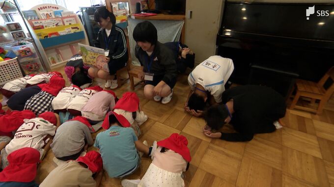 ぐらぐら揺れたら「だんごむしのポーズ」大学生から高校生そして園児へ 遊びながら…