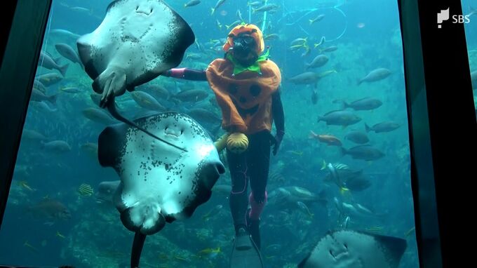 ハロウィン前に“カボチャダイバー”登場! 大水槽で魚の餌付けショー=静岡・下田…